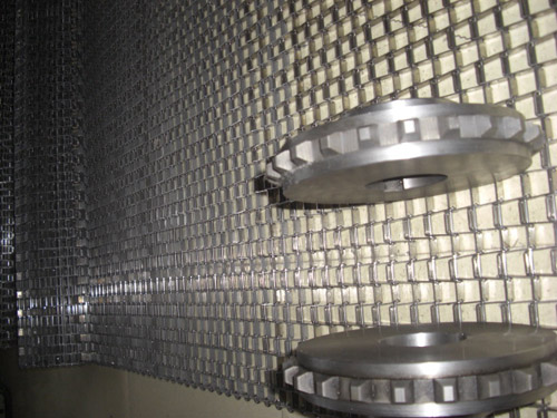 馬蹄鏈又稱長城網(wǎng),由扁平金屬片和圓金屬絲所組成,網(wǎng)帶自重輕,網(wǎng)孔空隙大,網(wǎng)面平整,運行平穩(wěn),不會走偏。可作洗滌、干燥、冷卻、熱處理的輸送線。