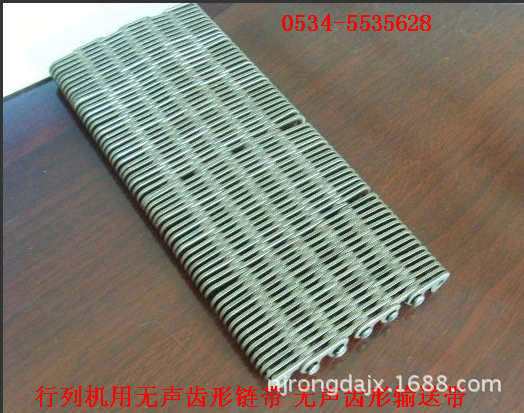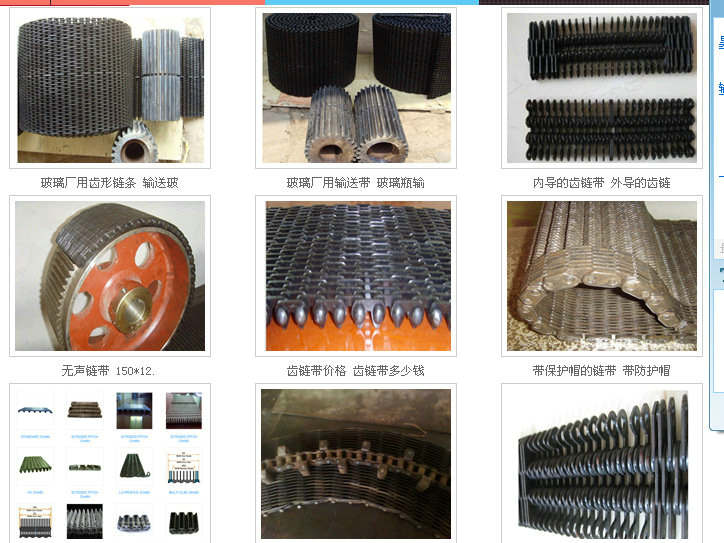 無聲齒形鏈帶:一種輸送帶,是玻璃廠或者陶瓷制品廠用來輸送玻璃制品器皿,玻璃容器或者陶瓷廠用來輸送陶瓷瓶罐,陶瓷制品的輸送帶。利用無聲鏈輪帶動,具有無噪音,耐磨,抗拉伸,輸送面平穩(wěn),耐高溫。